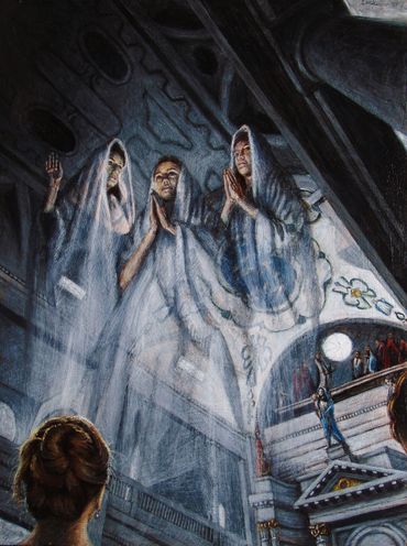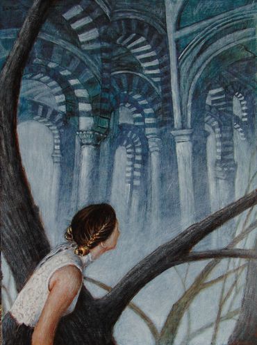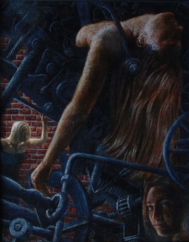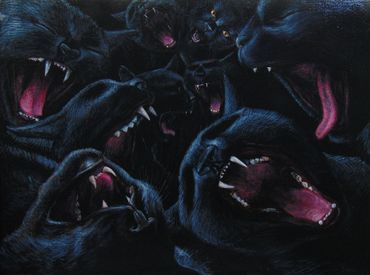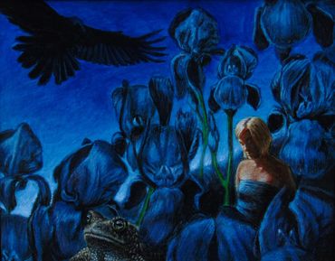 When I was very young, my elderly, widowed neighbor used to invite me into her house for tea. This was back when kids could roam the woods all day without parental supervision and occasionally wander into an old lady's house. Although hers was a modest little place, she had a fine old oil painting in a massive gold frame hanging over her couch. The picture seemed more valuable than the entire house. It depicted waves crashing onto a rocky shore on a stormy night. What really fascinated me was the fact that a certain weather-beaten boulder in the foreground looked to me like a vicious dog’s head. It gave me the feeling that there must be something dark and unknown lurking beneath the surface of that picture. About the same time, the one painting hanging in my parents’ home was of white roses on black velvet. I found it almost as exciting as the seascape because those roses also looked like snarling dogs’ heads. As a kid, I was never quite certain if the dogs’ heads in either painting were really there or if I'd only imagined them. Before long, that painting started infecting my daily life, and I was seeing growling dogs' heads in trees, clouds, rocks, and floorboards. I am still drawn to that sort of haunting, enigmatic image. That is probably the genesis of the mystery paintings.
